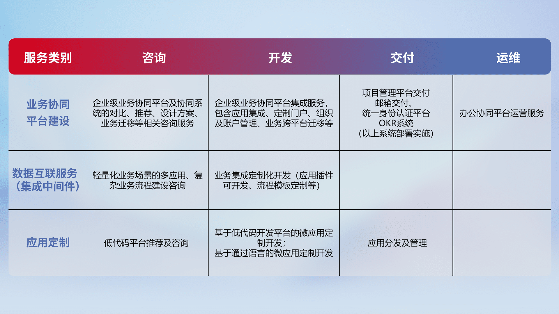 针对钉钉、、、企微、、IDaas等平台级产品提供产品的规划、、、、方案、、、、交付、、、定制化开发等服务,,,实现如统一协同办公、、智能客户服务、、、、混合会议管理、、、智能数据查询、、、等业务场景,,,实现数字化转型。。。
